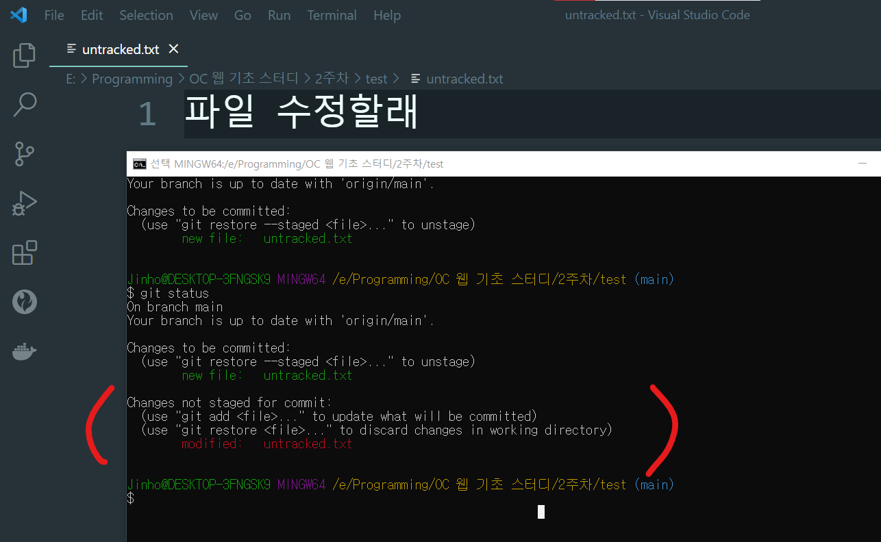 새 txt 파일인 untracked.txt를 만든 다음 git status를 입력하니 사진 하단과 같이