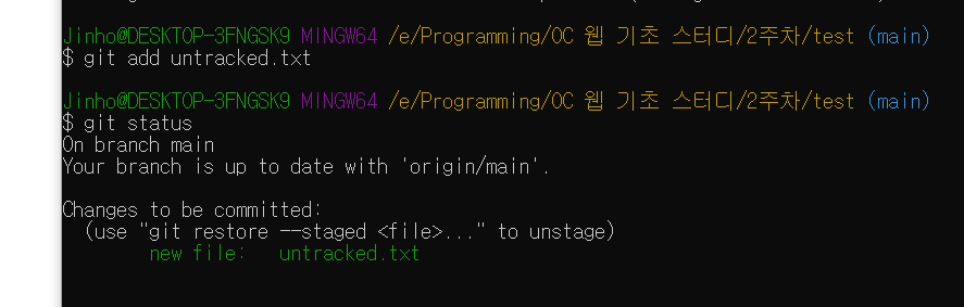 add 커맨드에 의해 untracked.txt 파일은 Staged 영역에 들어가게 되었고,